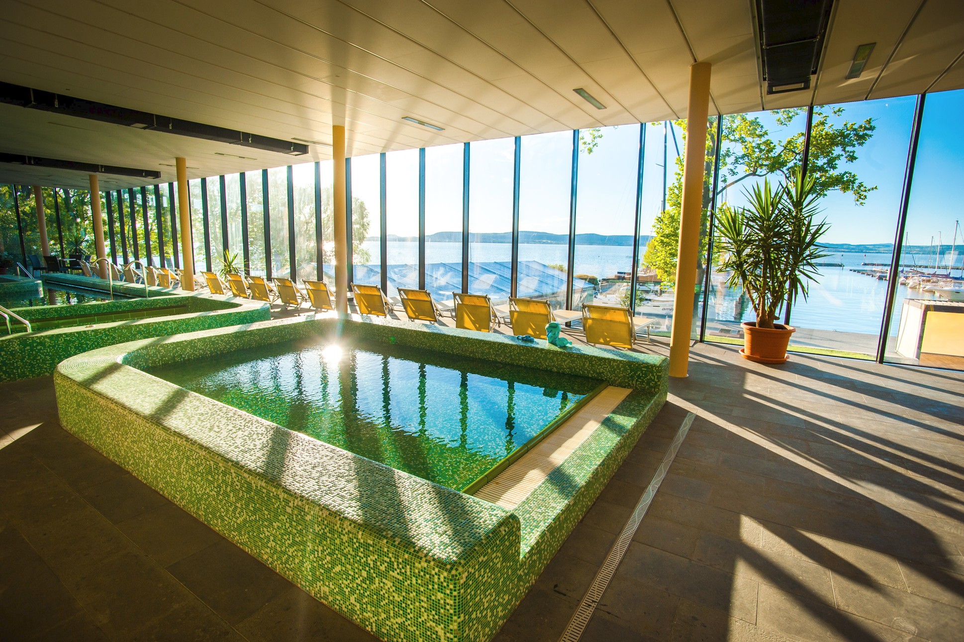 Wellness, megencék, szaunák, fitness, TRX, squash, homokos privát strand, bérelhető vitorláshajó, zárt parkoló